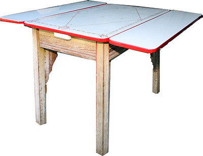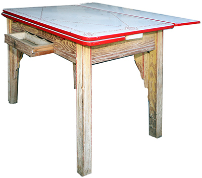 Vintage red and white enamel top kitchen table from the 1940’sLocation: Plymouth, MI near Beck & Ridge Roads. Height: 31 inches Material: Enamel top. Used condition. See photo. Wood base and drawer. Needs stabilizing and refurbishing. Side leaves slip under center of table. One built-in silverware drawer. Email Address: jm@jmgoodstuff.com or call 269-363-1014 |